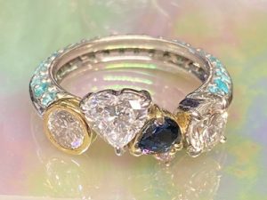 4つの宝石が寄り添う「しあわせ(4つ合わせ)」リング。パライバが彩る安心リメイク新着!!