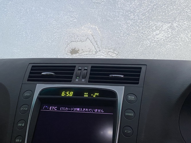 車の中からフロントガラスは霜でガチガチ。