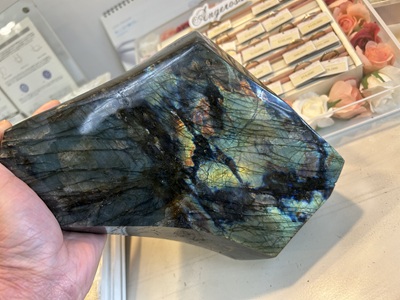 イベントで九州に出向いていた時、(もう20年ほど前になろうかと…)このラブラドライトに衣服を巻き付けグルグルに保護し、スーツケースに入れて持ち帰ったのを記憶しています。。