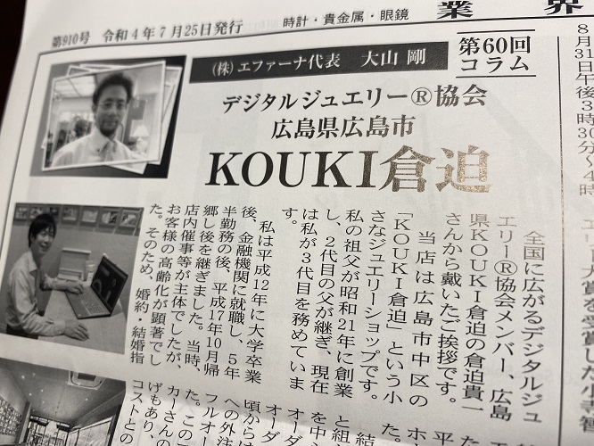 全国に広がるデジタルジュエリー®協会メンバー、広島県 KOUKI倉迫の倉迫 貴一さんから戴いたご挨拶です。