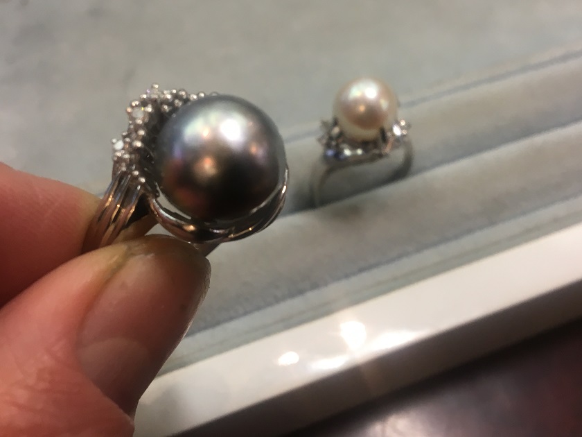 今回はこの真珠、ブラックのバロックと大粒のあこや真珠。