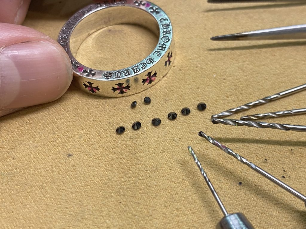 そして上面のクロスの中心部にもブラックダイヤを石留していきます。