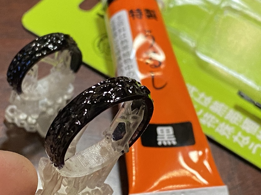 これは3Dプリントに黒漆を塗ってみたもの。
