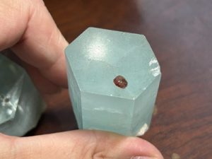 緑柱石が成長する過程に紛れ込みそれを置き去りにしさらに成長した原石。