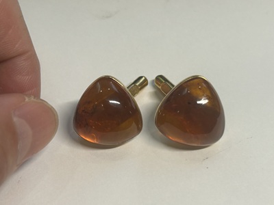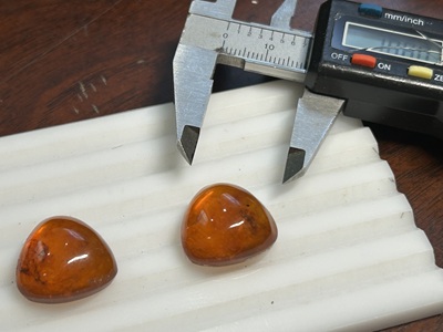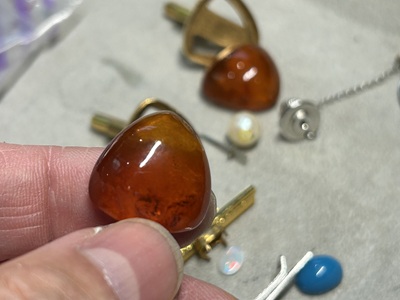 ベースの金具から無傷で琥珀を分離することから始めていきます。ルーペを用いて観察。。透明な接着剤での固定ですね。