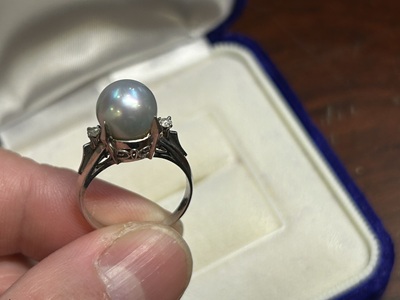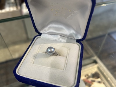 まん丸、シルバー系のとっても美しい真珠の指輪。