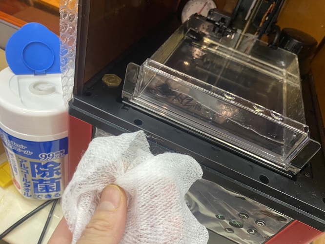 ショップ内の3Dプリンタ…連日の酷使の為か液垂れ、液漏れ…。