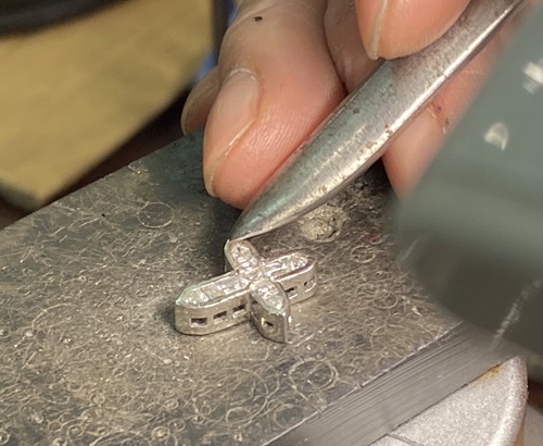 バランスを見ながらヘリの地金を少しづつ倒してダイヤモンドを留めていきます。