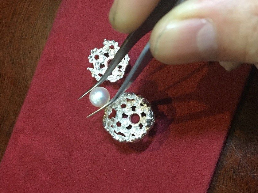 表面の磨きを入れ、用意していたのはあこや真珠の組み入れです☟