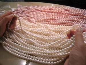 ロット買いでランクを選別し金具を取付けネックレスへと加工。