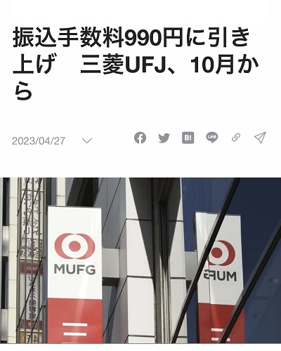 振込手数料990円に引き上げ 三菱UFJ、10月から