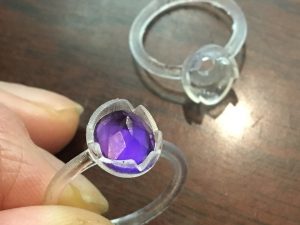 プラチナ鋳造まで完成。 最終磨きを経て石留へ! これが一連の工程です。 3Dデータから3Dプリント 3Dプリントしアメシストの座りを確認し ゴム型からワックスを取り石膏埋没。 この段階で一度石が止まった感じ […]
