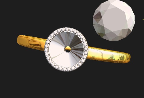 カップ状のシャトンにダイヤモンドを入れ込み、リング腕に乗せると完成形が見えてきます。