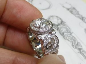 「こんな感じにしたいけれど、うまく説明できない…」そんなぼんやりとしたイメージを形にするのが、エファーナの得意技です。お持ちのダイヤモンドを余すことなく使用し、全周にこだわりの唐草模様をあしらった、世界に一つだけの特別なリングが完成するまでの工程を、10枚の写真とともに詳しくご紹介します。